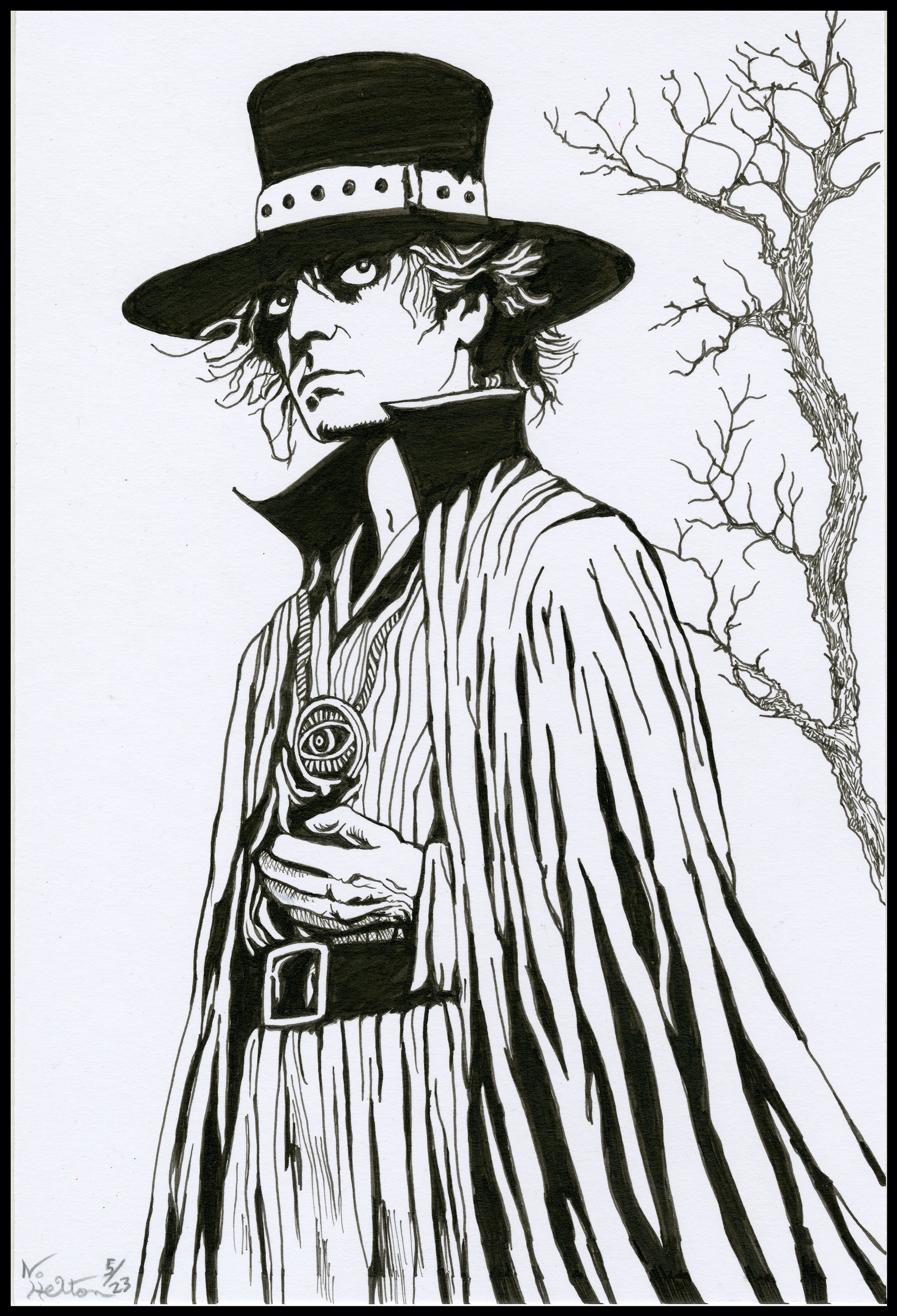 A hand-drawn portrait of a warlock from a series of ink drawings featured on my Dear Dead Daze youtube/Tik Tok channels.